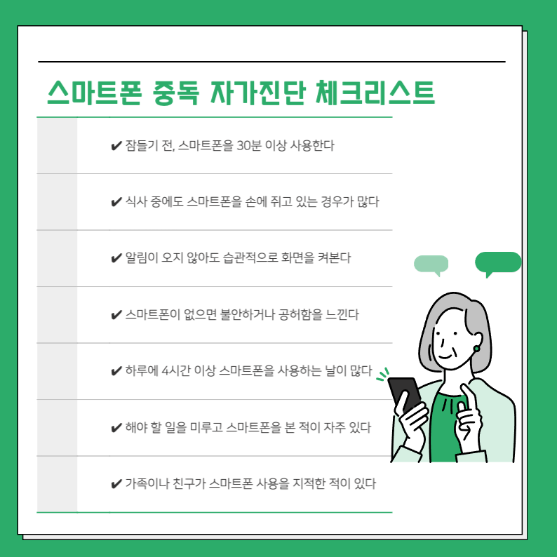 혹시 나도 스마트폰 중독일까? 아래 항목 중 해당되는 게 몇 개인지 체크해보세요. 4개 이상 해당된다면, 지금이 바로 생활 습관을 점검해볼 때입니다.