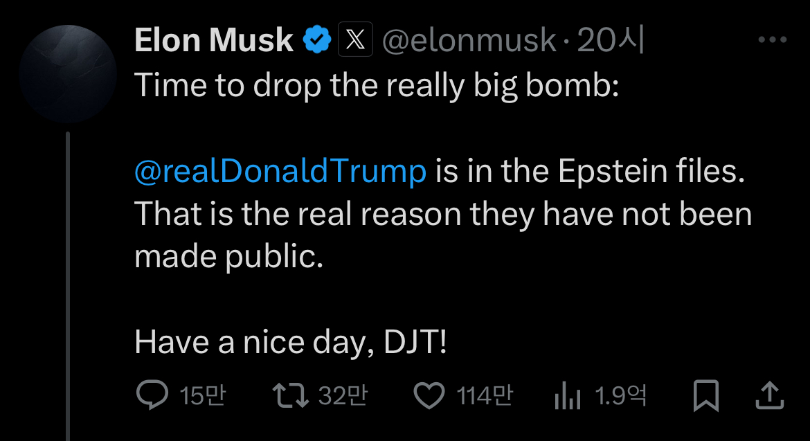 그리고 결정적으로, 머스크는 한 유저가 올린 "Trump should be impeached"라는 글에 ‘YES’로 반응하며 정치적 결별을 공식화했습니다.