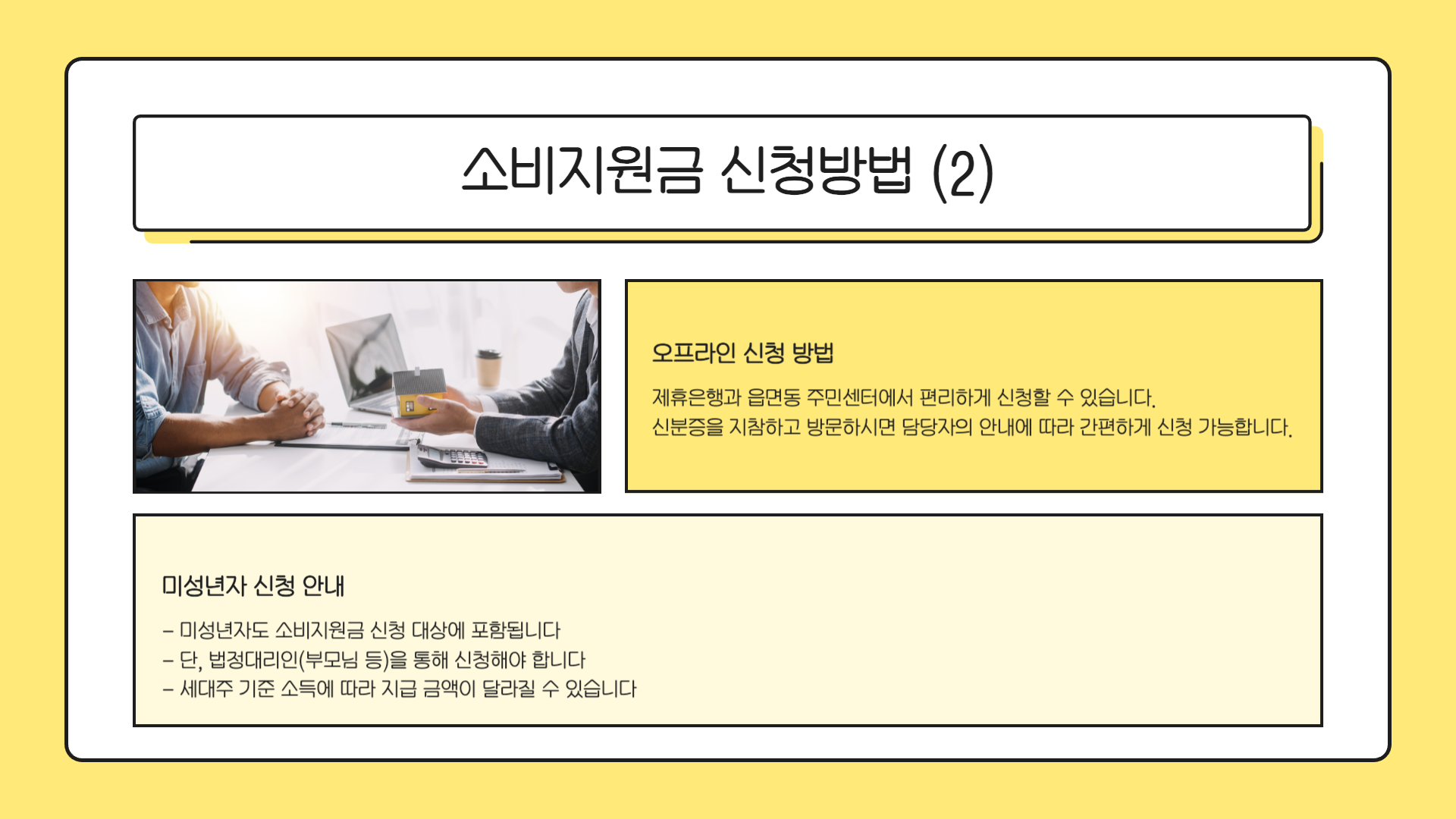 - 오프라인: 제휴은행, 읍면동 주민센터